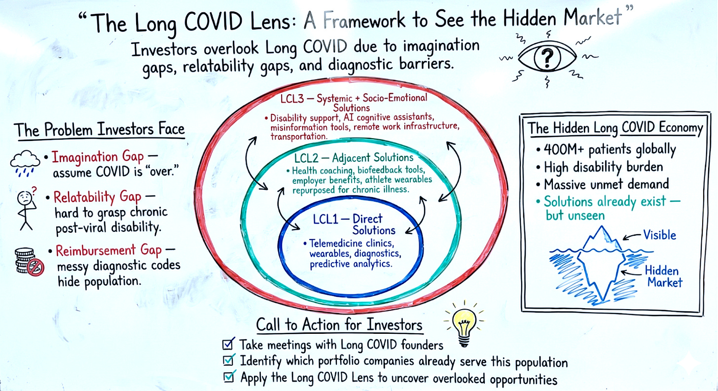 It is hard to understand how a virus most of us have been exposed to could render a triathlete immobile for years, unless you’ve seen or experienced it yourself. So, to make this idea feel real, and hopefully actionable, I propose coining a new framework to help investors spot innovations to address this problem: The Long COVID Lens.
